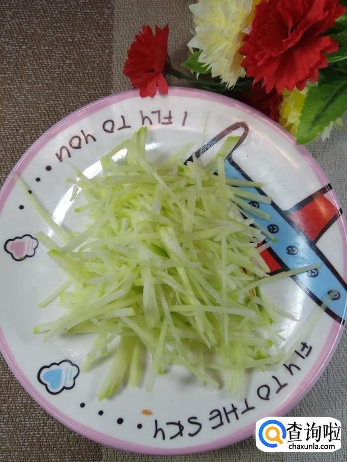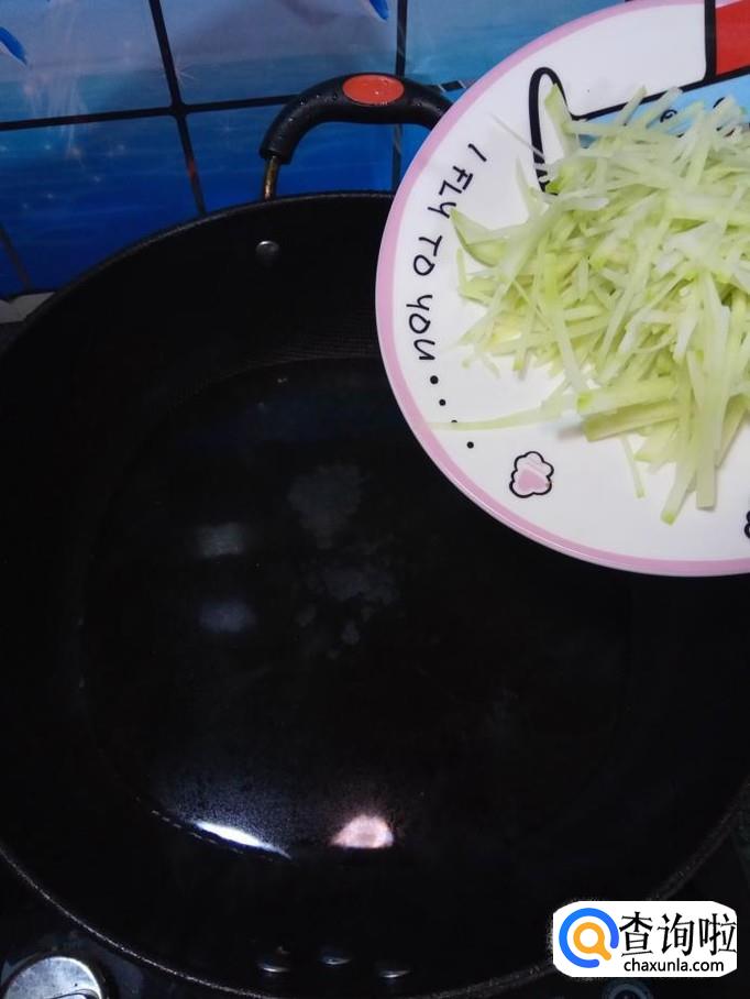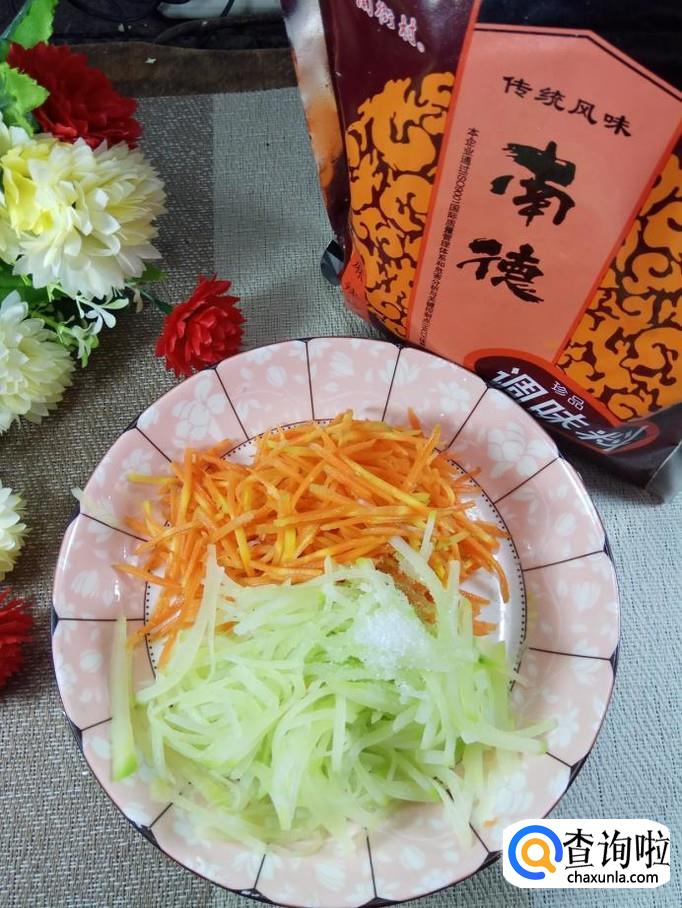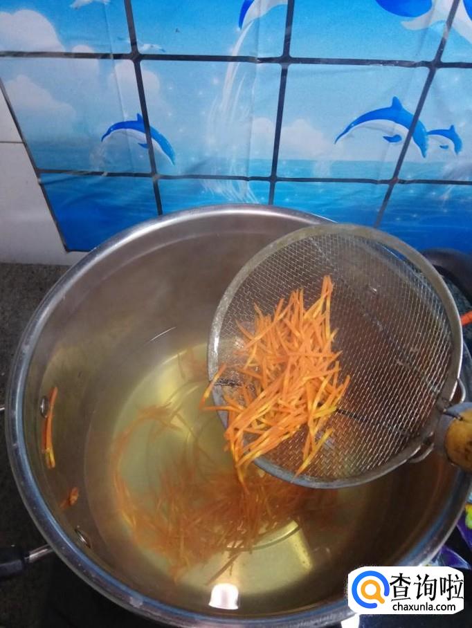 锅中烧开水,水开后,将绿皮萝卜丝和胡萝卜丝倒入锅中,分别焯水,焯好之后,放在一起备用。