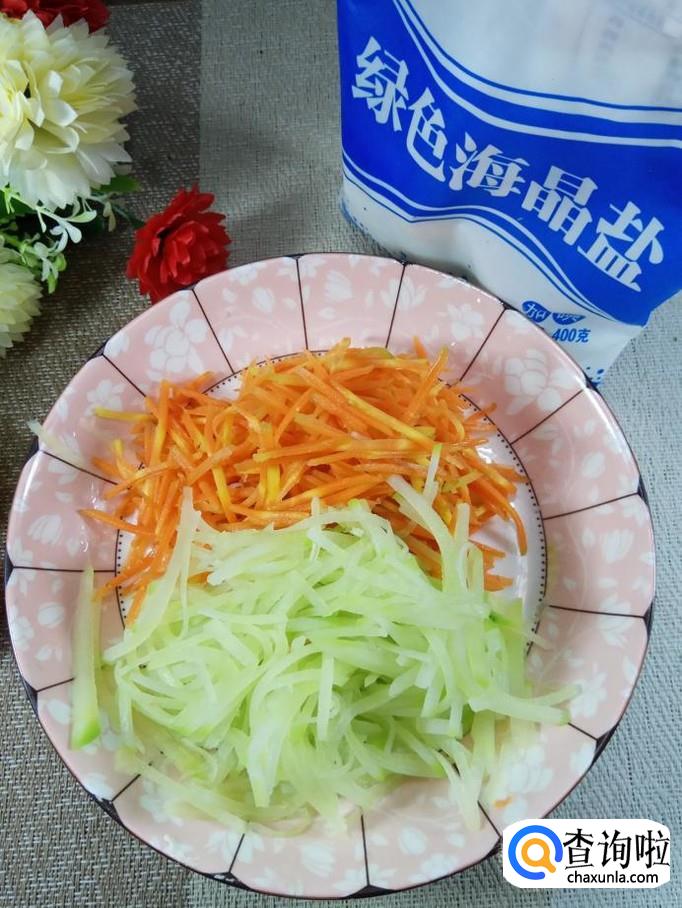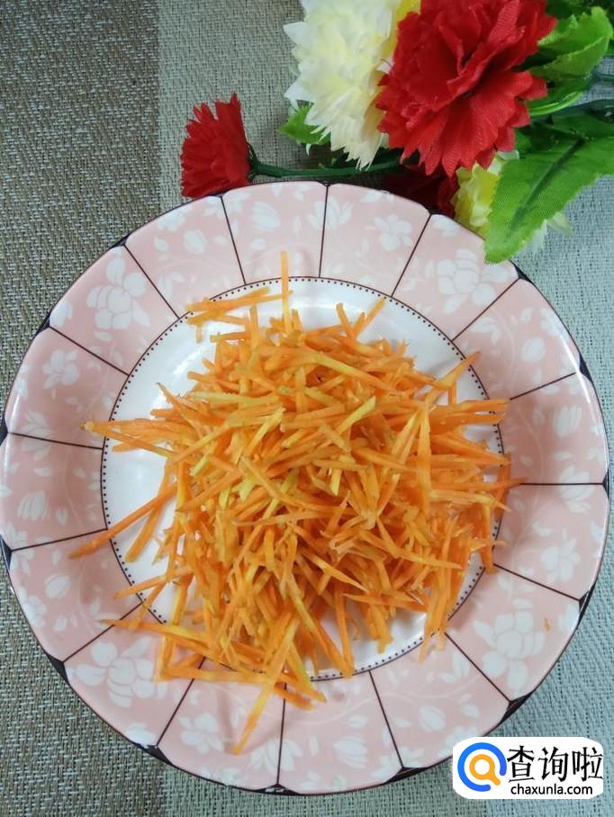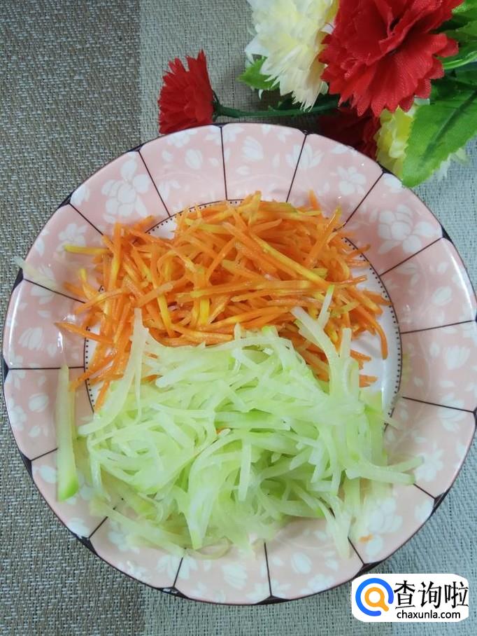 将绿皮萝卜和胡萝卜洗净后,去皮擦成丝,放入盘中备用。