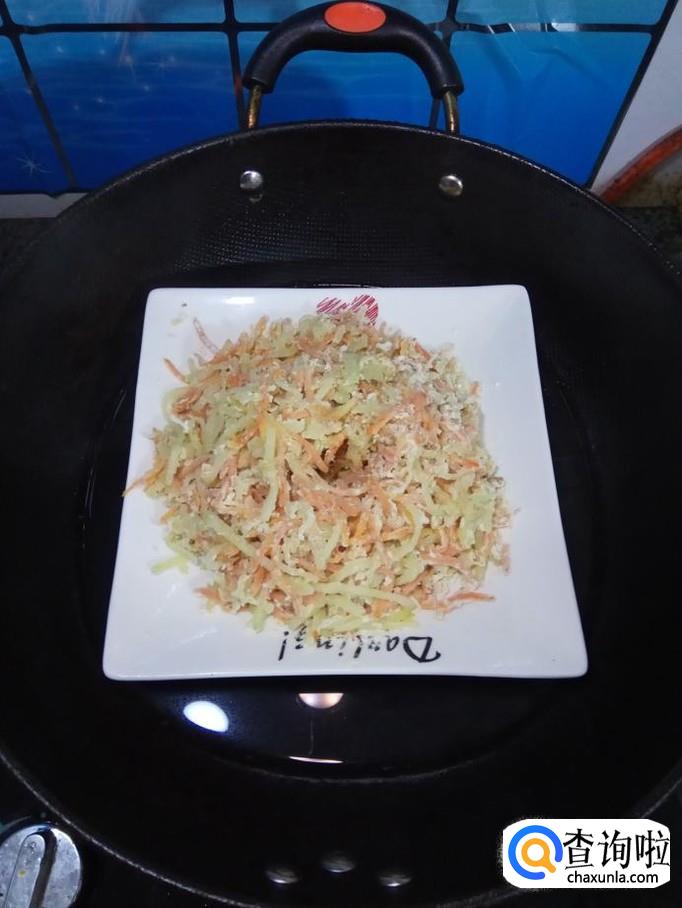 锅中烧开水,水开后,将处理好的萝卜丝放入锅中,中间挖一个洞,蒸十分钟左右。