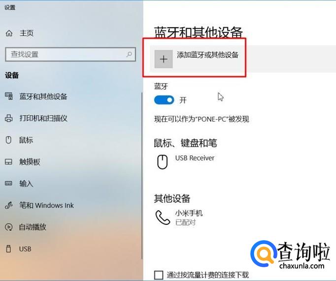 蓝牙开关打开之后,转到蓝牙设备设置页面,在设置页面中,点击“添加蓝牙或其他设备”按钮。