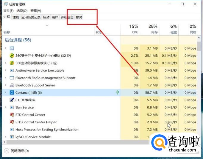 首先,打开系统中的任务管理器页面,点击页面顶部“服务”选项卡。