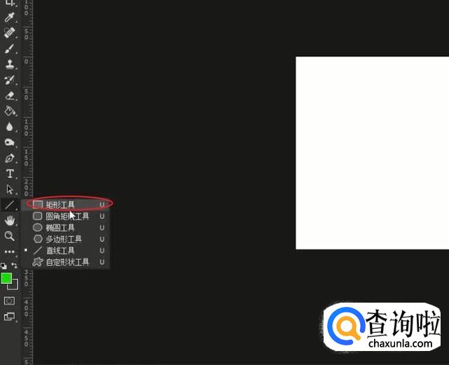 移动鼠标指针到形状工具图标,通过长按鼠标左键2秒左右,选择子级菜单下的矩形工具。