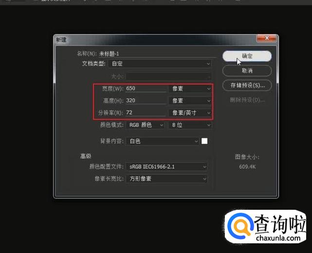 新建一个文档,尺寸设为:650×320,分辨率72像素/英寸。
