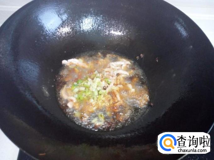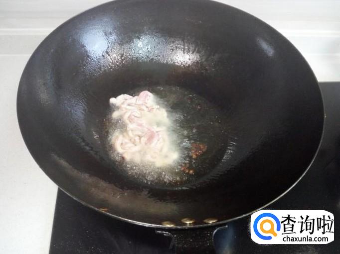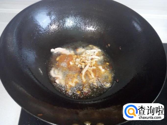 锅内放入油加热,油热后放入花椒爆锅。放入肉丝翻炒。