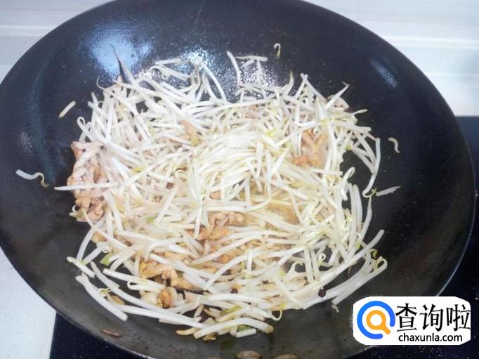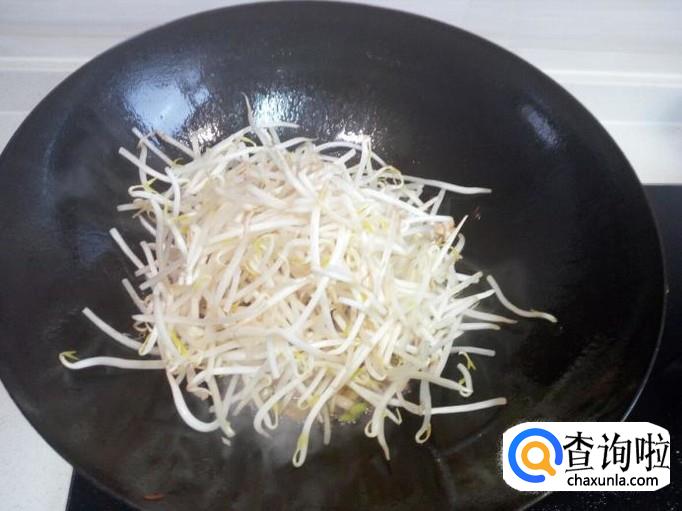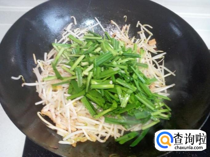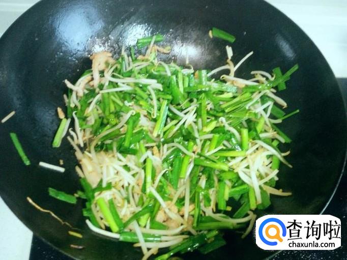 炒至绿豆芽断生,放入韭菜翻炒,放入盐。
