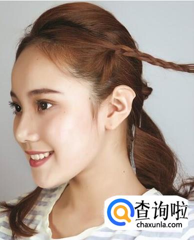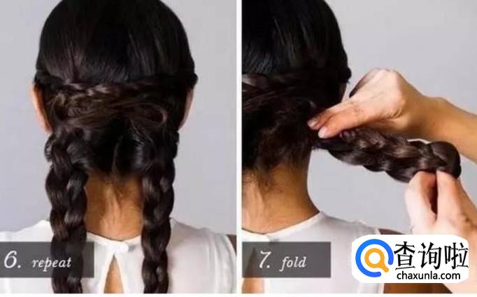 另外一边的长刘海重复以上的步骤,两条发辫重叠在一起固定好,最开始编好的麻花辫对折。