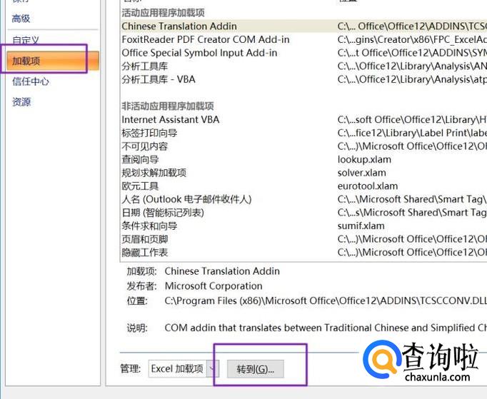 弹出的界面,我们点击加载项,然后点击转到;