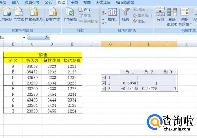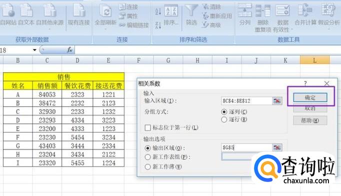 弹出的界面,我们点击确定,这样就用相关系数对数据进行分析了,结果如图。