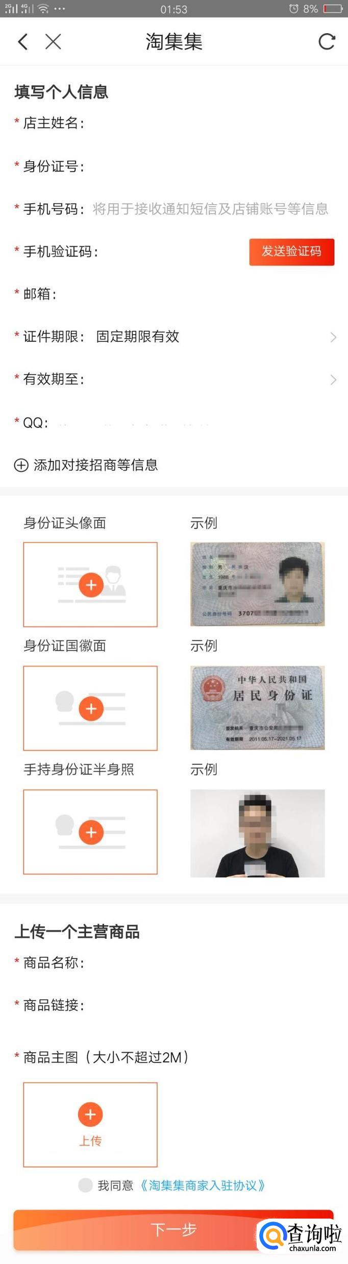 填写好了店铺名称和主营部分的信息后点击下一步会来填写个人信息和身份证认证的界面,把个人信息填写完后点击下我同意在点击下一步等待审核就可以了,如图