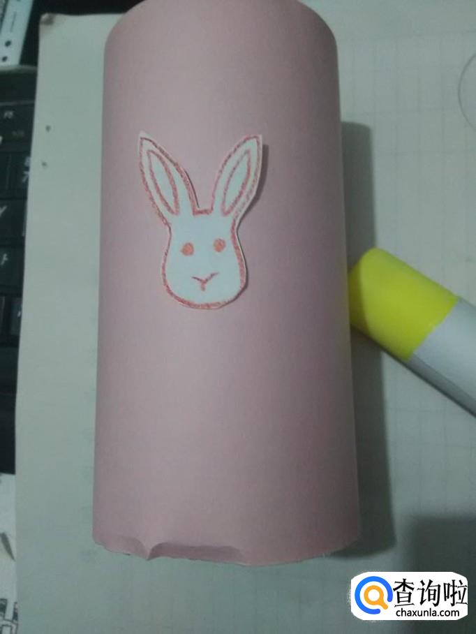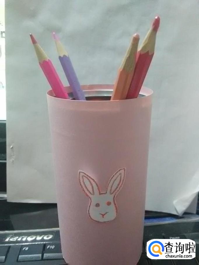 用胶棒在小兔子头的背面抹上胶,把小兔子头粘在笔筒中间,一个漂亮又实用的笔筒就做好了。