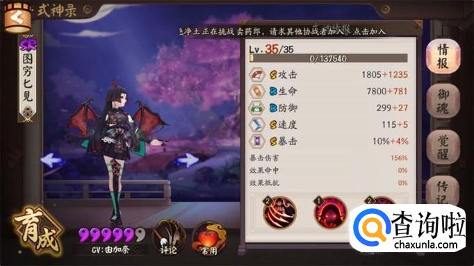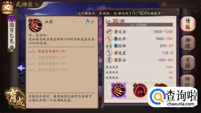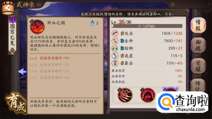 我们再来看看吸血姬的面板属性攻击还有暴击和速度都是S,而防御和生命是B。这个属性其实和很多SSR式神没有区别,而且面板速度能达到115的已经算是速度快的式神了,吸血姬虽然可以先手但是打不出输出。吸血姬是典型的越战越勇的式神,站得住就能赢。