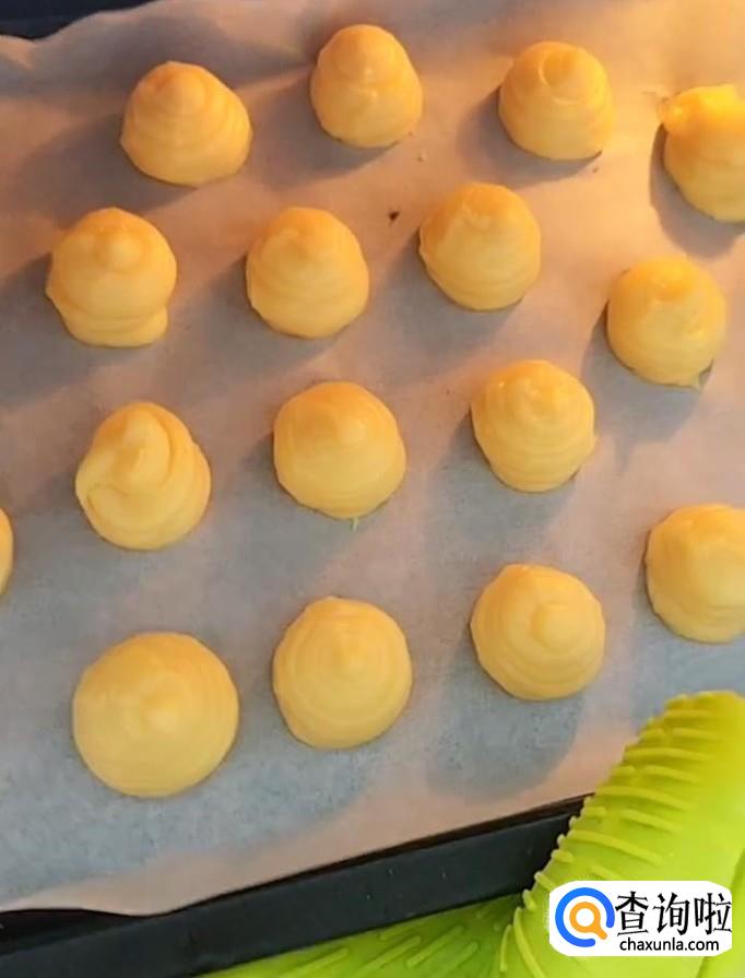 接着,烤箱180度预热5分钟,把挤好的泡芙放入烤箱烤25分钟