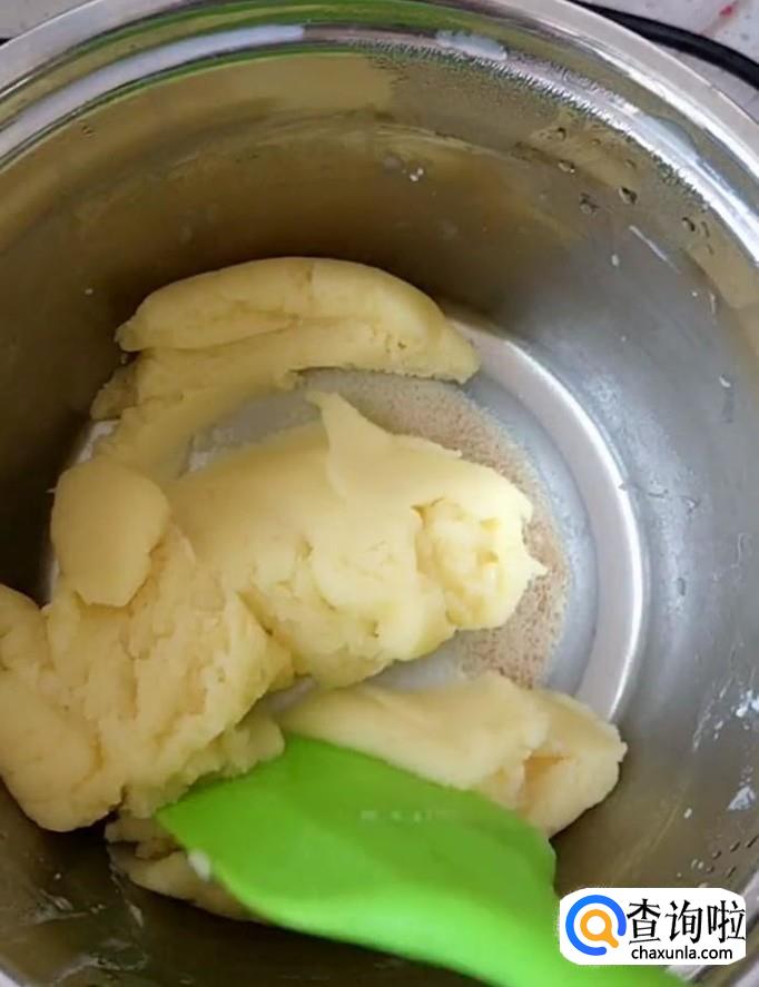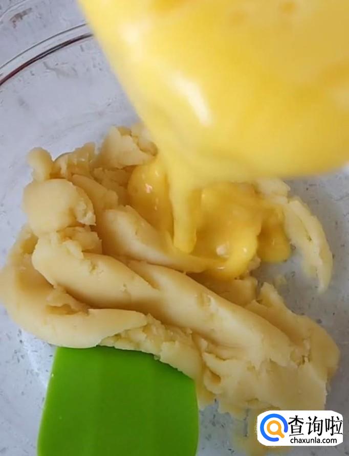 把两个鸡蛋打散,然后分三次倒入面糊中,翻拌均匀