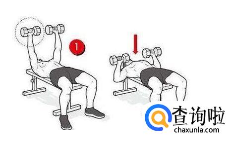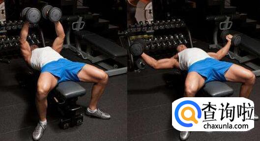 平板哑铃卧推平板哑铃卧推能锻炼到胸大肌中部。做法:仰卧在平板上面,两只脚平放在地面上,两脚间距略窄于肩,挺胸,背稍弓,臀部始终紧贴平板。向上推起,两肘内收,夹肘的同时夹胸。哑铃向上的同时略向前偏,呈抛物线的运动轨迹。两臂伸直时,哑铃重心接近处于肩关节的支撑点上。