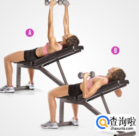 上斜哑铃卧推上斜哑铃卧推能够锻炼到上胸部肌肉,也可以利用杠铃来进行锻炼。做法:把斜板的角度调节为20-30度左右,仰卧在斜板上,两只手握住哑铃放置于肩的正上方,双脚平放在地面,背部紧贴斜板,腹肌收缩。