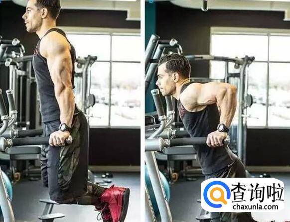 双杠臂屈伸双杠臂屈伸能够有效的练习胸肌下缘和外缘,使得胸肌呈现漂亮的板状。