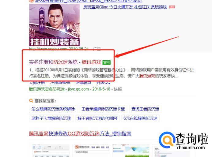 使用搜狗搜索“实名注册和防沉迷系统”,在搜索出来的结果中点击进入腾讯防沉迷官网。