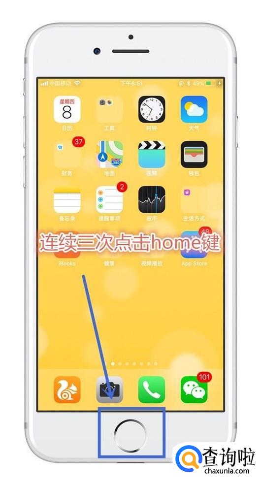 然后回到主界面,连续三次按下home键,如下图所示。