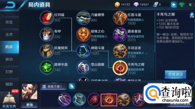 然后我们就该出不死鸟之眼了,该装备是曹操必须要出的装备,可以说是曹操专用的装备,该装备可以增加240的法术防御,其次还能加1200的血量,最重要的是被动非常适合曹操。
