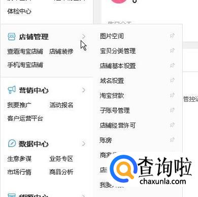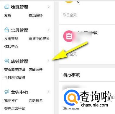 把页面往下拉,再看左侧,找到“店铺管理”;鼠标放在右边的>符号。