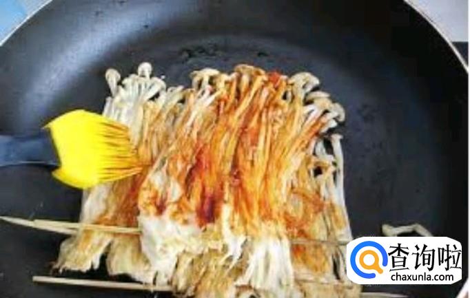 接着将金针菇放入锅中,小火煎至发黄变软,翻过来再煎,煎好后,把两面刷上辣酱,洒一些孜然粉和芝麻即可。