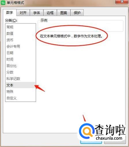 跳出此界面之后,选择“文本”,然后按“确定”,可以看到当你的单元格格式设置成为文本形式之后,数字作为文本处理。