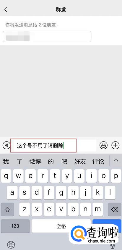 选择群发的好友,输入“号不用了,请删除”,通知好友删除你,这样就加快了删除的速度。