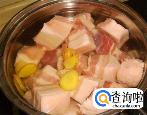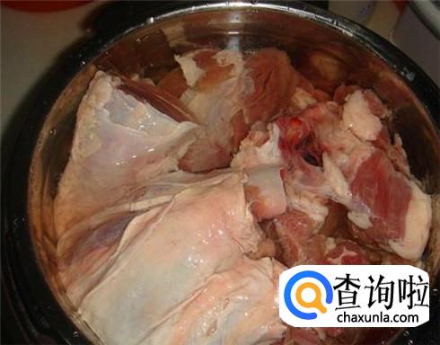 偏瘦一些的五花肉清洗干净切成大块,不要切小块,不然做出来的肉口感很硬不好吃,直接放进高压锅或者电饭煲里。