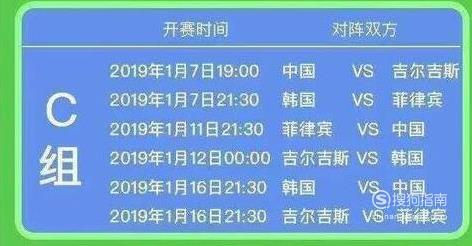 中国队被分在了C组,在这组织中韩国队为实力最强的队伍,中国队要想出线必须打败吉尔吉斯坦和菲律宾两只国家队。C组开赛时间为2019年1月7日,本组最后一场比赛时间为2019年1月16日。