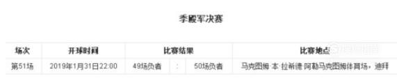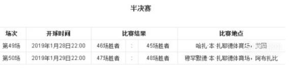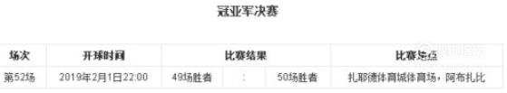 冠亚军决赛:2019年2月的第1天,晚上10点在阿布扎比的扎耶德体育城体育场来举行。如下图: