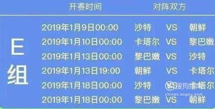 E组比赛赛程设置在了2019年1月9日-2019年1月18日,6场比赛时间跨度为10天,9日和10日各1场比赛,13日和18日各2场比赛,本组的球队实力均比较强,届时竞争会比较激烈。