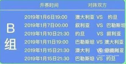 B组中实力最强的就数澳大利亚队了,本组的首场比赛安排也是在2019年1月6日,时间为19:00,其余的场次分别设在了7、10、11、15这4个比赛日。