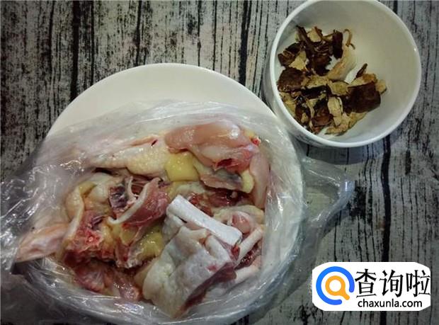 准备好所有原材料:清远走地鸡半边、野蘑菇适量。