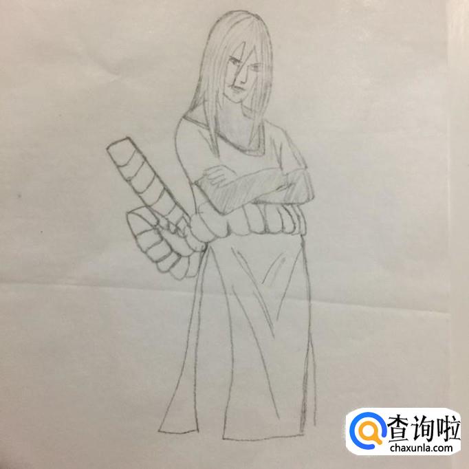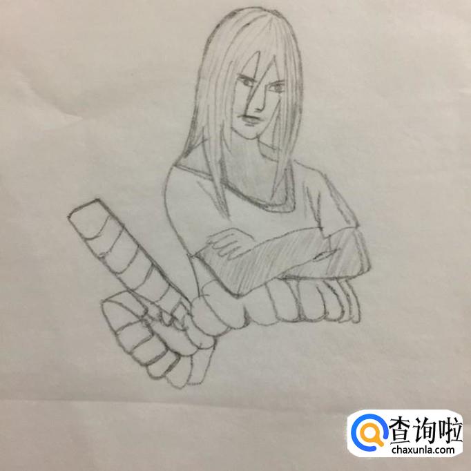 然后画出大蛇丸的双手,如下图所示。画这部分的时候应该注意的是大蛇丸的双手是交叉着的。同样为了画出来的大蛇丸更有层次感,要在大蛇丸手臂上轻轻的描上一些细小的线条。