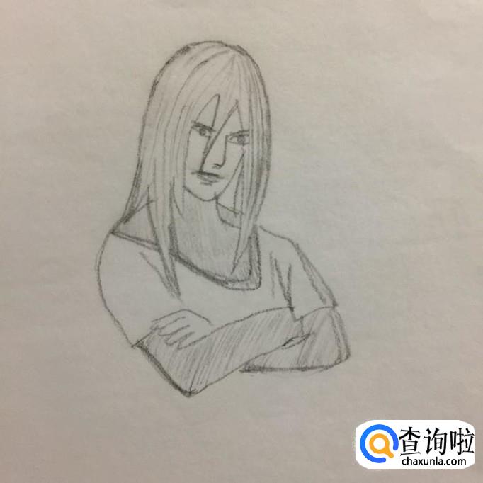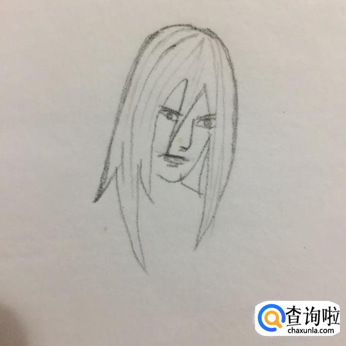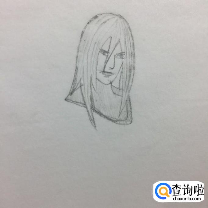 首先用铅笔在A4纸上画出大蛇丸的头发,如下图所示。在画大蛇丸头发的时候要特别注意的是,要画的左长右短。为了让画出来的大蛇丸更有层次感,可以在大蛇丸头发上轻轻描一些细小的线条。小编之所以选择先画大蛇丸的头发,那是因为小编是通过大蛇丸的头发来定位大蛇丸身体其他部分的大小的。