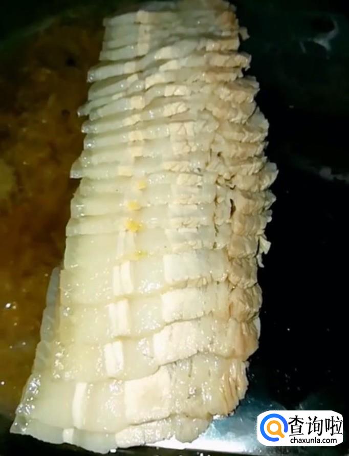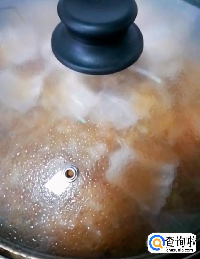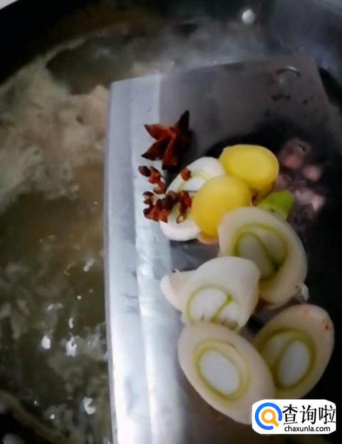 接着我们放入葱姜,花椒,大料,再放入适量的盐,开小火,盖上锅盖,炖20分钟,炖好以后将五花肉取出切片备用