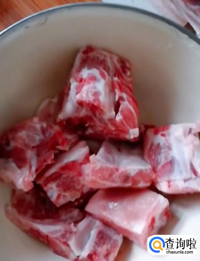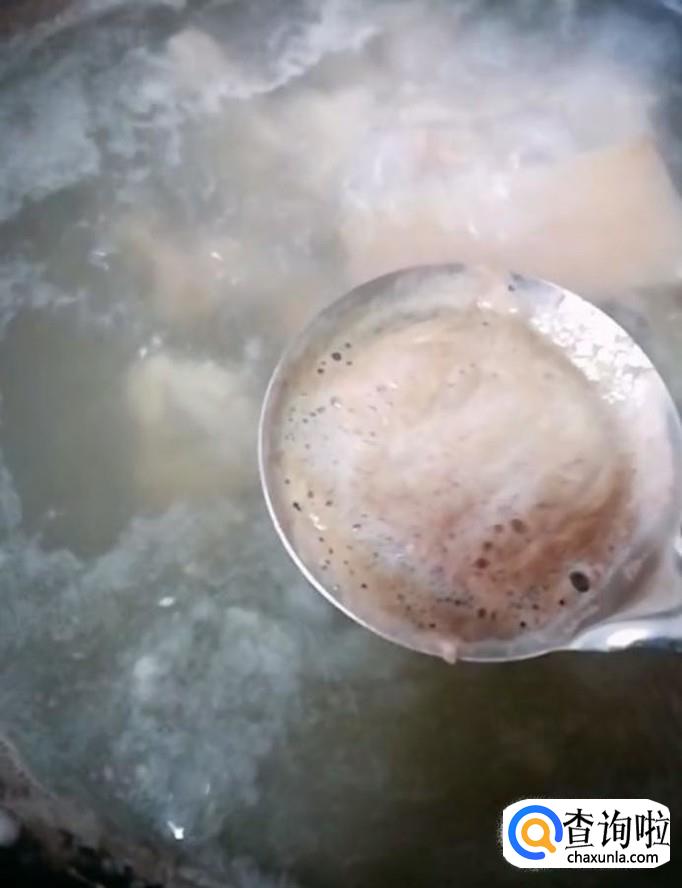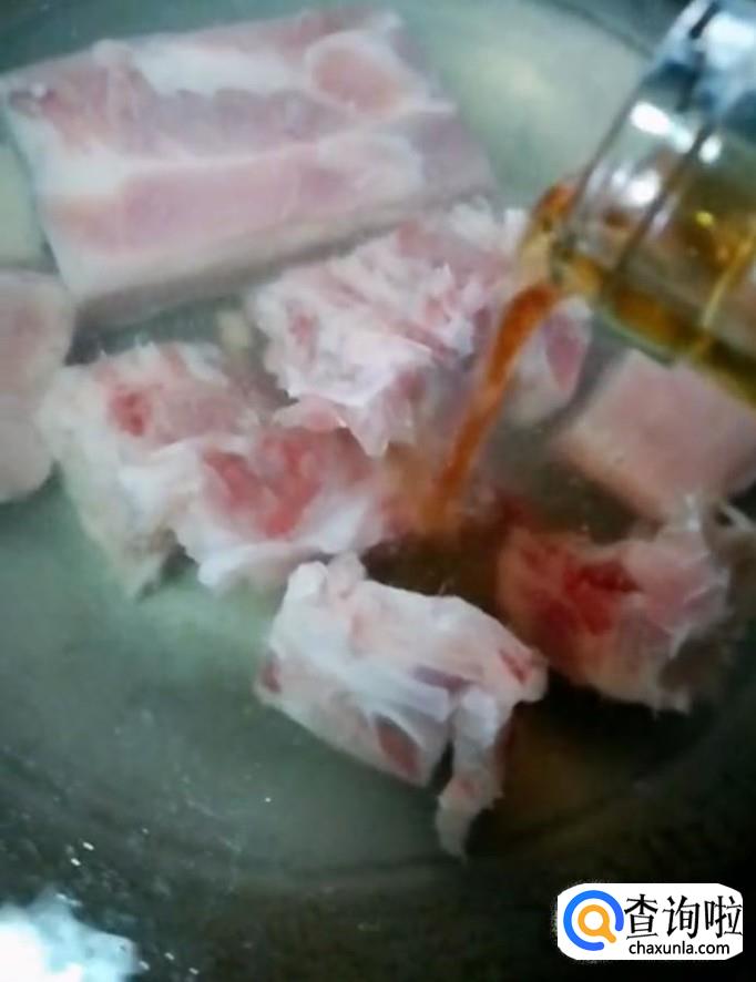 然后我们把五花肉与排骨放入冷水锅中,加入适量的料酒,煮开以后撇去浮沫