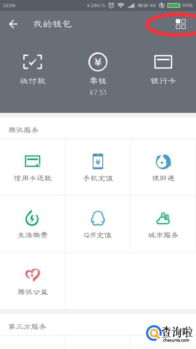 接下来,打开微信钱包页面之后,点击右上角的方格按钮,进入微信支付中心设置页面。