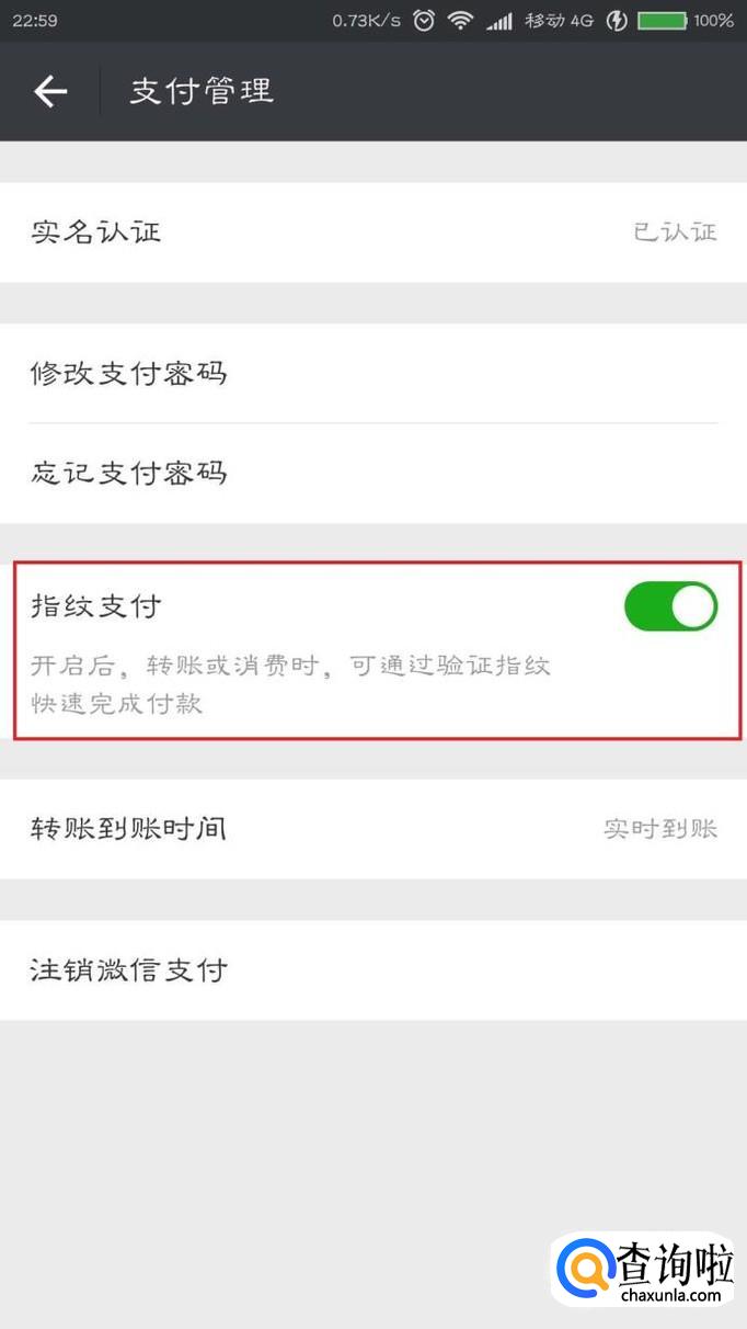 在支付管理设置页面中,我们可以看到微信支付指纹设置按钮的开关,点击将此按钮打开,使之处于开启状态,这时候我们就已经成功开启了微信使用指纹验证进行支付。
