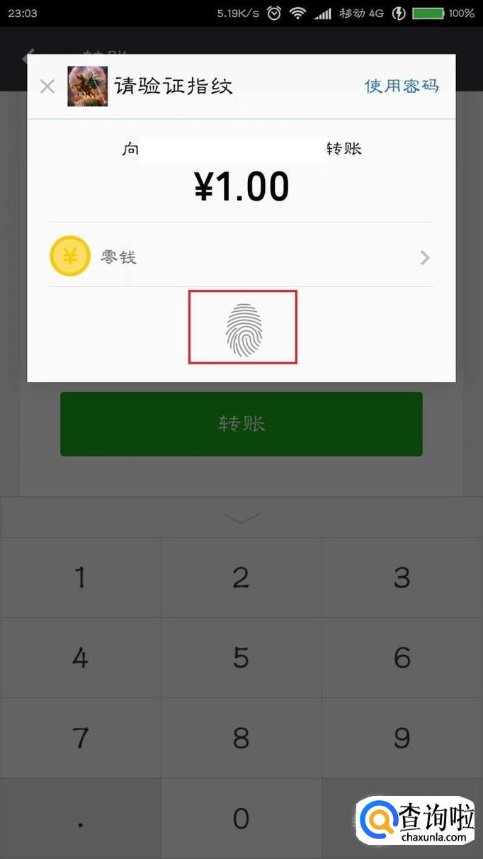 最后,我们可以试着给好友发微信红包,在确认支付的时候,可以明显的看到已经成功调用了指纹验证功能,我们只需验证指纹之后即可顺利完成支付过程。