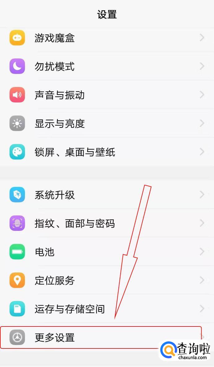 打开手机设置,找到“更多设置”(各种品牌的功能位置可能不一样,但是目标相同)。