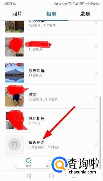 进入相册后我们下拉到底部回看到“最近删除”我们点击进入。