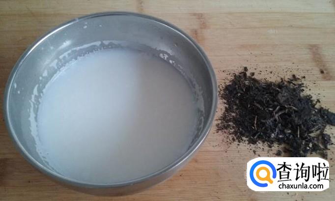 把煮熟的牛奶倒碗里,把砖茶切成碎渣。
