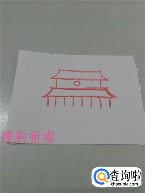 先用彩笔在纸上画一个梯形,梯形的两侧要画得弯一些,表示最高层的房檐儿。