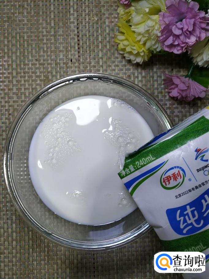 准备两包纯牛奶,大约有一斤左右,再准备100毫升酸奶,放入盘中备用。
