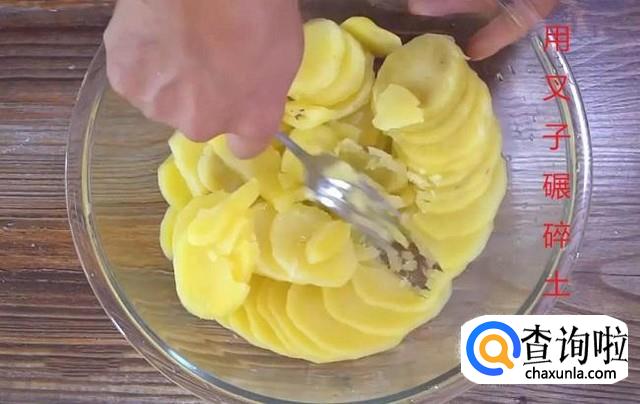 接下来我们将切好的土豆放入碗中,用叉子把土豆弄成土豆泥,如下图所示
