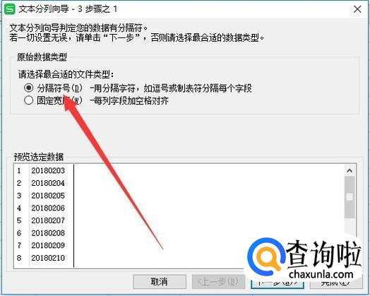 进入之后,选择“分隔符号”,点击“下一步”,如图所示。