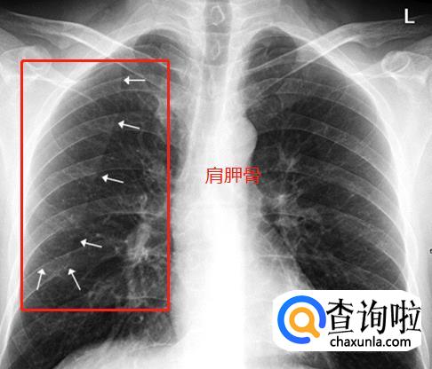 肩胛骨。如果投照时体位标准,上肢内旋充分,则肩胛骨应当位于肺野之外。否则肩胛骨将重叠于上肺野偏外的区域,呈与胸壁平行的条带状高密度影,此时可能会被误认为是肺内病变。仔细观察可见肩胛骨影从肺内向肺外延伸,即可与肺内病变区别。下图双上肢未充分内旋,导致双侧肩胛骨大部分重叠于双肺中上肺野中外带,导致相应肺野条带状密度增高。白色箭头标示右侧肩胛骨内侧缘,向肺外延续。左侧肩胛骨情况类似。