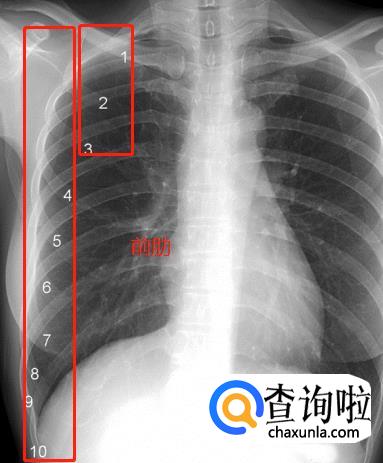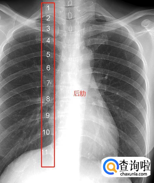 肋骨。一根肋骨在正位胸片上投影的前后端并不在同一水平,为了便于描述,肋骨被人为的分为后段(后肋)和前段(前肋)两个部分。后段通常是肋骨从胸椎到肺野外缘的投影,走行大致水平或略向外下倾斜。前段从肺野边缘起向内下呈比较大角度的斜向走行,越是接近第11、12肋的肋骨,其前段向下倾斜的角度越大。图中1~11分别标示第一到第十一后肋。
