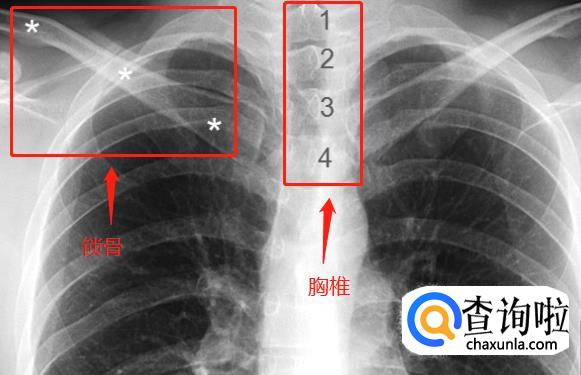 胸椎。胸椎正位胸片上,投照条件比较合适时,第1~4胸椎能够清晰识别,锁骨两侧胸锁关节与胸部正中线等距,图中1~4分别标示第一到第四胸椎,其余胸椎隐约可见,白色星号标示右侧锁骨。